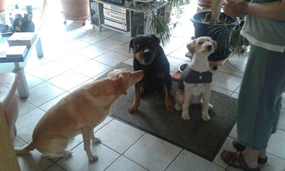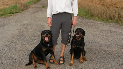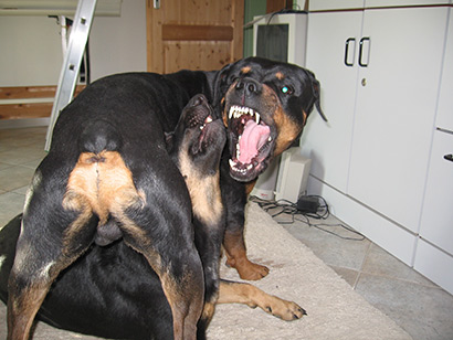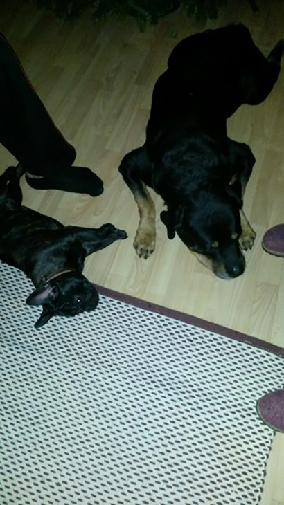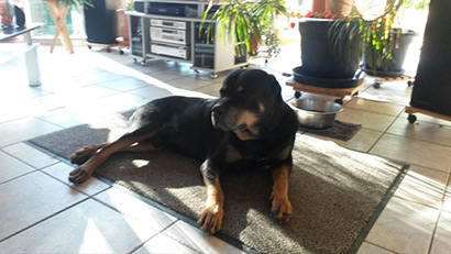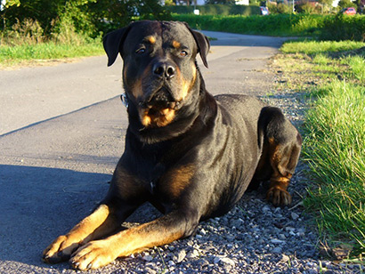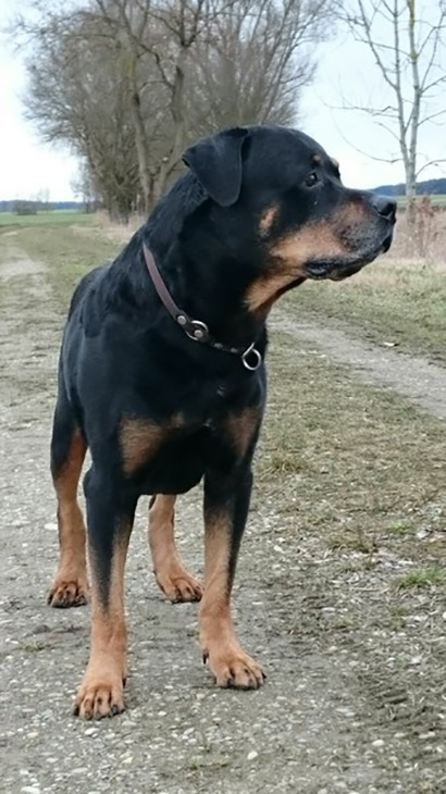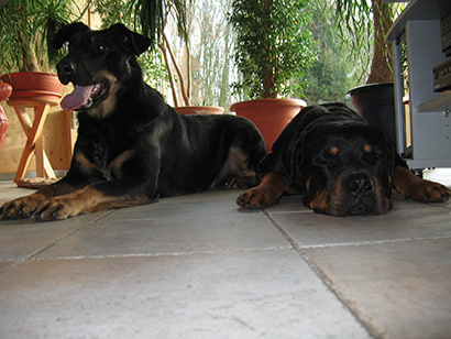 Er ist ein reiner Wohnungshund. Am Anfang dachten wir, es wäre für ihn doch bestimmt toll im Auslauf (100 qm) zu sein wenn wir nicht da sind. Pustekuchen – die Klinke hat er abgebissen. Sieg auf ganzer Linie – er hat das Haus besetzt. Als Wachhund kann man ihn nicht bezeichnen er schläft lieber. Auch fremde Leute im Garten stören ihn nicht. Er ist kein normaler Rotti. Ich glaube er hätte Katze werden sollen.