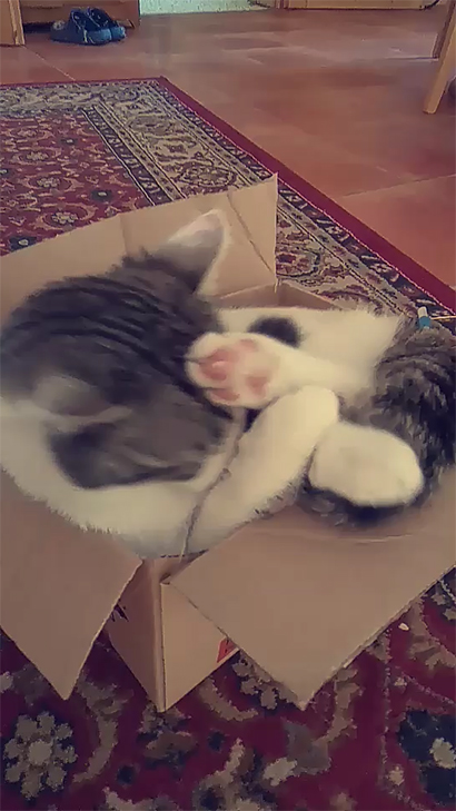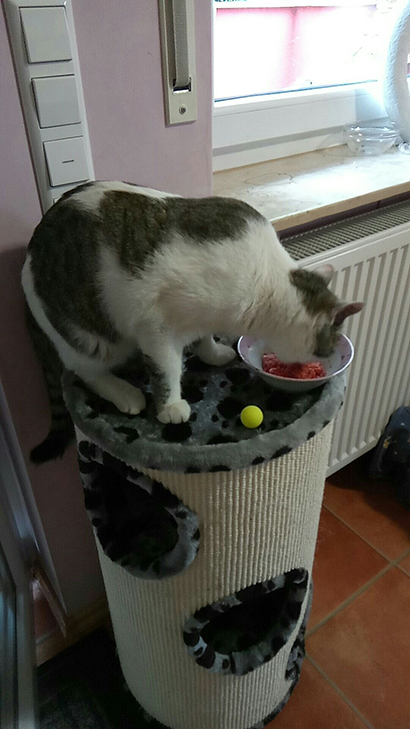 Copain heißt jetzt Bounty. Bounty war von Anfang an überhaupt nicht ängstlich. Er ist neugierig und sehr, sehr verspielt. Er macht natürlich auch manchen Unsinn, aber es ist auch sehr lustig. Er will sogar mit Rio (Hund)schmusen, aber Rio bekommt dann Angst.