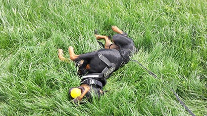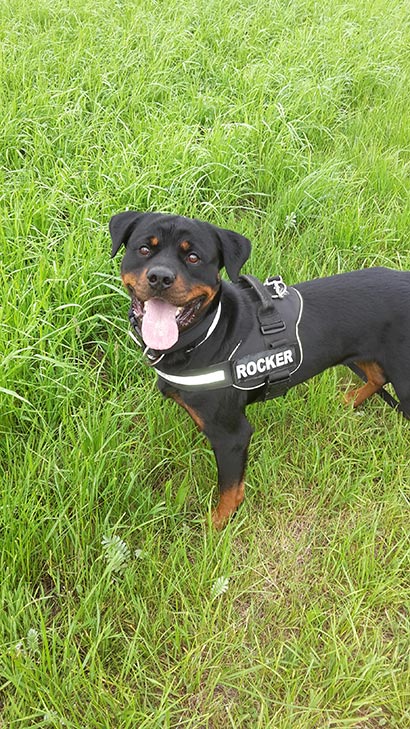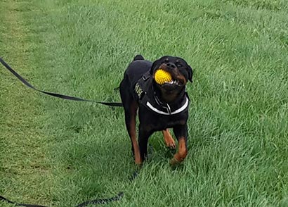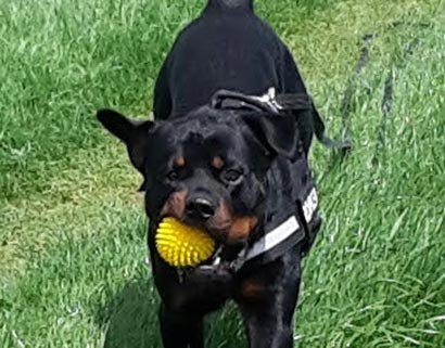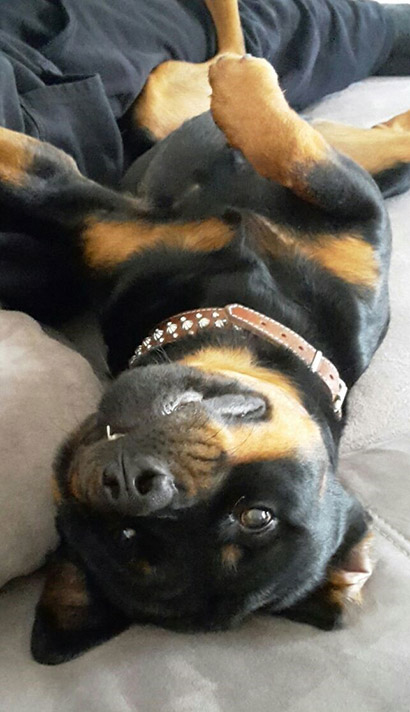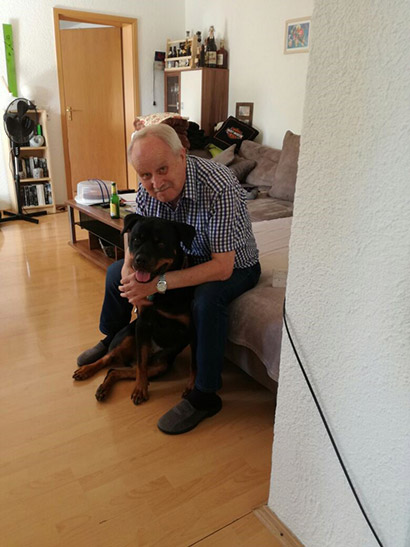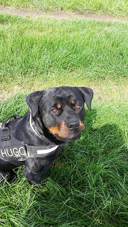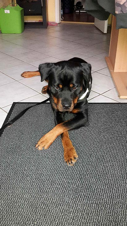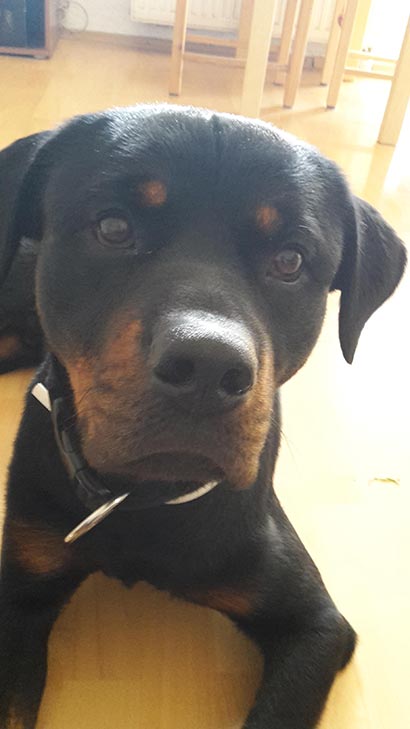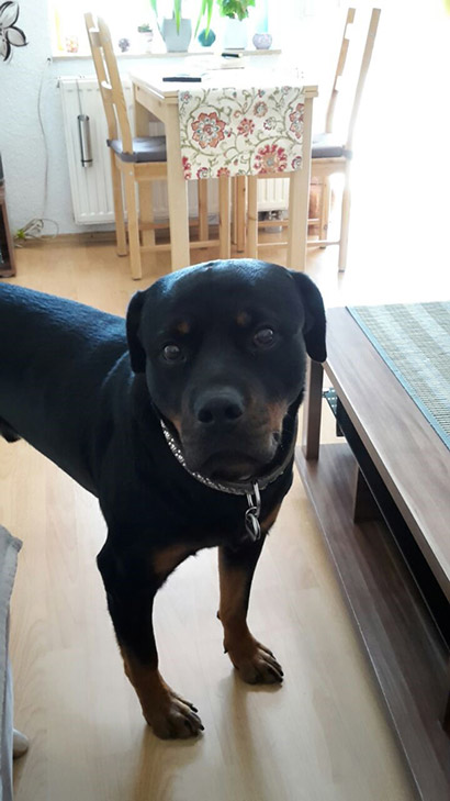 Ich bin unendlich froh, dass wir Hugo geholt haben... nach fast drei Wochen ist es schon so als wäre er immer bei uns gewesen. Er bringt uns dauernd zum Lachen und ist einfach nur ein riesiger Quatschkopf. Er liebt es mit seinem Ball zu spielen, dabei hat er in zwei Tagen gelernt, dass er ihn bringt und los lässt. Hugo lernt unheimlich schnell, er kann Sitz, Platz, gibt Pfote, lernt gerade Fuß laufen und auf die Ferne absitzen. Er ist super abrufbar und ich finde es irre, wie schnell er lernt. Hugo ist mit Menschen unheimlich lieb und anhänglich und sehr offen, er hat ein tolles, ganz sanftes Wesen und begrüßt Besucher freundlich. Manchmal ist er anfangs etwas unsicher aber das ist ok und nicht aggressiv. Er braucht dann einfach unsere Unterstützung, orientiert sich an uns. Wenn wir ihm dann zeigen, dass wir alles im Griff haben und es kein Problem gibt, ist alles in Ordnung. Er braucht einfach jemand der ihm Sicherheit gibt. Hugo hat ein kleines Problem mit anderem Hunden, er bellt, gibt dann an und baut sich auf... ich denke auch hier ist viel Unsicherheit dabei. Allerdings lässt er sich gut ablenken mit seinem Ball und trotzdem abrufen, dass kriegen wir mit Zeit und Übung also sicher auch in den Griff. Mit Hündinnen wird es glaube ich auch gut gehen, er braucht einfach noch ein bisschen Zeit und Rüden sind eben Sympathiesache. Aber sonst läuft alles super, Hugo kann ohne Probleme allein bleiben, er schläft dann und macht auch nichts kaputt. Hugo ist einfach ein rundum toller und lustiger Rotti und wir sind glücklich, dass wir ihn geholt haben.