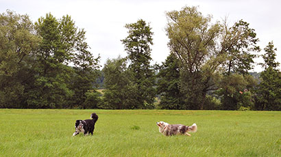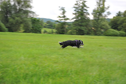 Ein anderes Mal gehen wir zum Spielen auf eine ganz große Wiese. Dort flitzt Blue dann so einem fliegenden Teller hinterher, dass ist mir zu doof was soll ich denn mit so einem Teller wo kein Würstchen drauf ist…;-) Doch Stöckchen spielen macht mir auch Spaß ;-) Blue flitzt dann immer schon los…