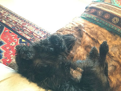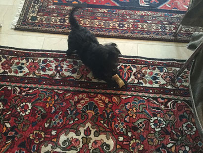 Rocky ist ein ganz lieber, süsser Kerl. Die Heimreise hat er gut überstanden, leider auf den letzen 2 km noch etwas erbrochen. Am ersten Abend hat er das Wohnzimmer abgeschnüffelt und am Sofa, an dem unser früherer Hund immer entlang gestrichen ist, einmal markiert und das war es dann. Bisher war er ein ganz Braver und hat noch nie hinein gemacht. Geschlafen hat er neben meinem Bett auf einem Teppich. Bei den Hundekörbchen hat er noch nicht begriffen, dass die ihm gehören. Fressspiele macht er gerne. Seinen ersten Schuhknochen hat er gestern verputzt.