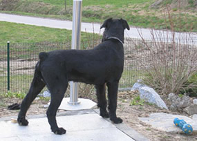 großen Garten mit einem hohen Zaun. Es ist notwendig, sonst springt er darüber.