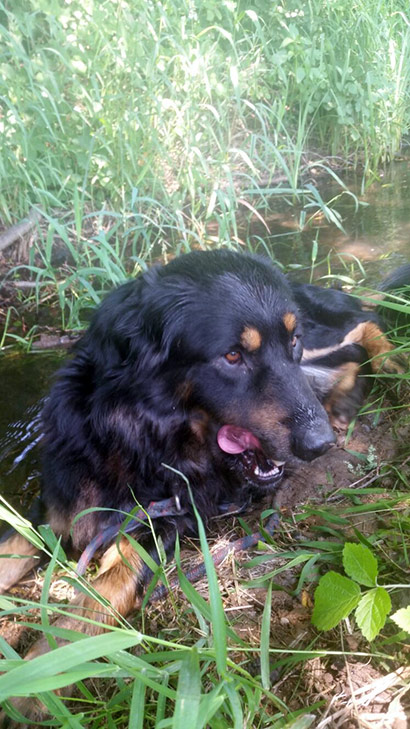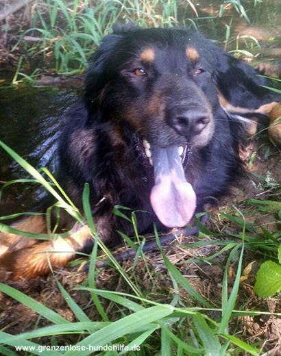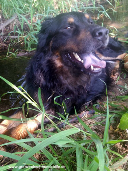 Als es so heiß war sind wir ans Wasser gegangen. Auch hier zeigte er erst einmal großes Misstrauen und wollte sich dem Wasser nicht nähern. Ich habe mich einfach ans Ufer gesetzt und gewartet. Das hat Ihn stutzig und zugleich neugierig gemacht und so hat er sich dann doch langsam genähert. Nach geraumer Zeit ging er ins Wasser zum trinken und hat sich dann neben mich ans Ufer gelegt um die Frische im Schatten zu genießen.