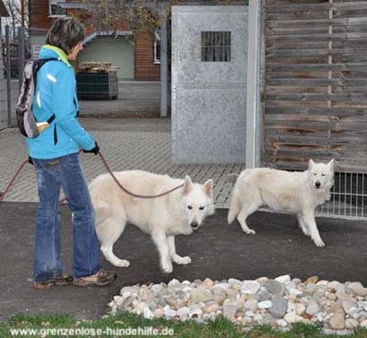 Die Hündin hängt wahnsinnig an Dakota, so dass man für sie nicht mal eine Leine benötigt um Gassi zu gehen. Wir können Auxia unmöglich von Dakota wegnehmen, sie braucht den Rüden in diesen Zeiten an ihrer Seite. Er gibt ihr Halt, den Willen und vielleicht auch die Kraft noch durchzuhalten.