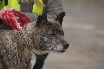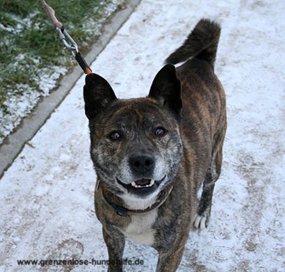 Der Akita Inu Mix Rüde lebte zuerst in einem Haus und wurde dann, als man umziehen mußte, mitgenommen.