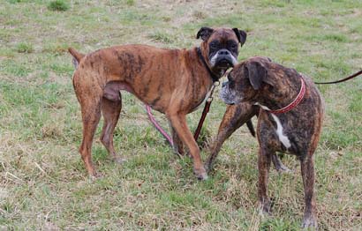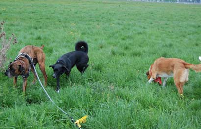 | Bayles mag zwar ein älterer Herr sein, seine Lebensfreude hat er aber nicht verloren. Als wir heute mit ihm einer Hündin und einem weiteren Rüden zusammen spazieren gingen, lief er sehr fröhlich und zügig mit. Bei der Spielaufforderungen von der Hündin reagierte Bayles ein bisschen schüchtern ;-)), aber nicht uninteressiert. Die Beiden verstanden sich ausgezeichnet! Auch mit dem anderen Rüden, der wie er unkastriert war, hatte der liebe Bayles keine Probleme. Beide begrüßten sich freundlich und gingen dann jeder ihrer Wege. Da gab es auch kein Gerangel wegen der jungen Hündin. Baylee war ein ganz lieber Begleiter, sowohl für Hund, als auch für Mensch! |