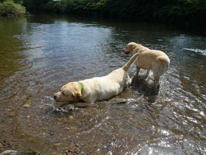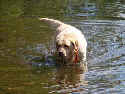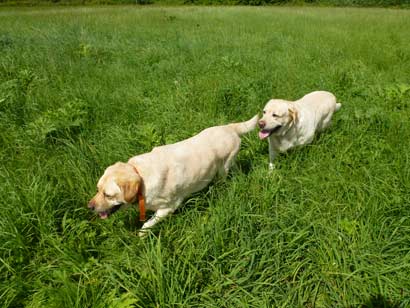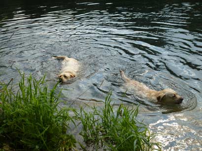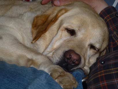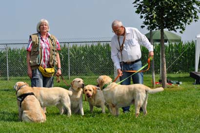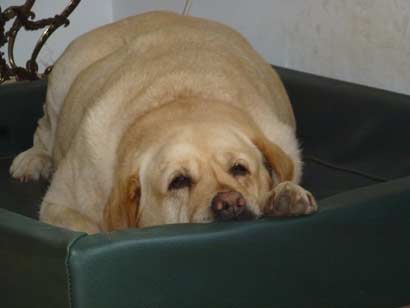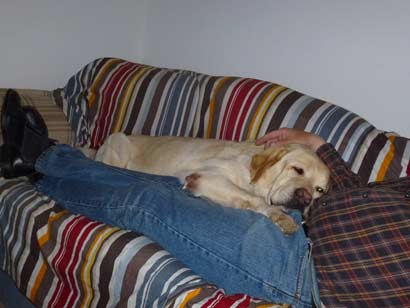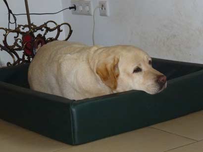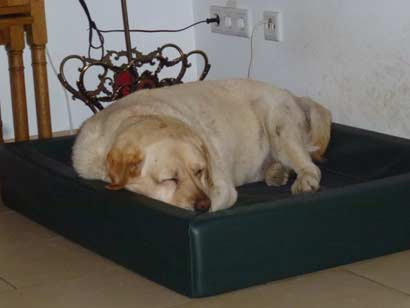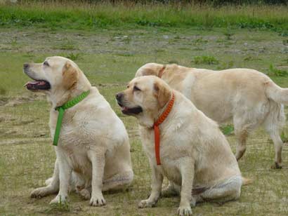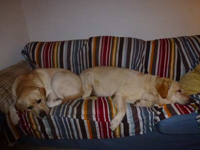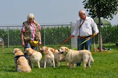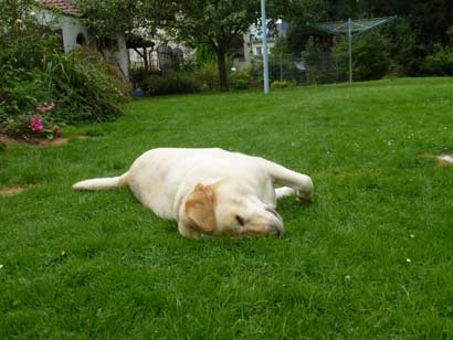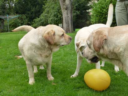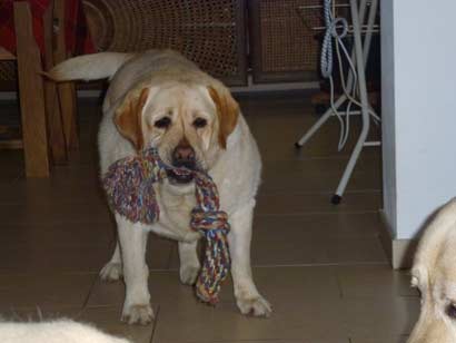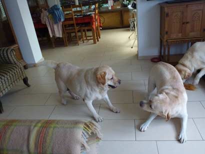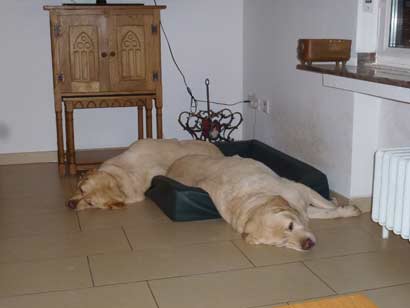 "Belle und Tommy sind nun mittlerweile 2 Wochen bei uns und unseren 3 gelben Labradors Alf, Ronja und Dougy. Die Zusammenführung war völlig entspannt, Aufreitversuche unseres unkastrierten Youngsters wurden kurz und knapp kommentiert und alles war geklärt. Belle und Tommy schlafen viel, anfänglich haben beide sehr viel und heftig geträumt,das lässt jetzt nach. Wir haben den Eindruck, daß die beiden sich einiges von der Seele geschlafen haben. Letzte Woche waren wir mit den beiden beim Tierarzt: jeder brachte seine gewichtigen 47 kg auf die Waage,aber unser TA sagte,nun ist langsames Abnehmen angesagt.