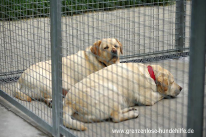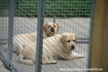 Einsam und unendlich traurig warten die beiden hellen Labradore auf ein gemeinsames Zuhause.