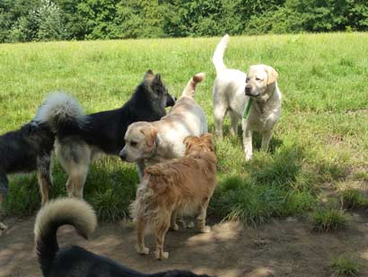 auch mehrere fremde Hunde sind kein Problem (mittig Dougy, rechts Tommy)