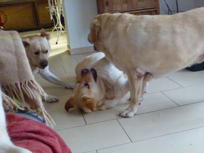 Uns, den beiden wahrscheinlich auch, kommt es allerdings schon viel länger vor. Mit unseren 3en gibt es keinerlei Probleme, im Gegenteil, die 5 haben ihre Gruppenstruktur gefunden. Madame Belle, von uns liebevoll "Fräulein Rottenmeier" genannt, hat alle gut im Griff, da sie eine souveräne, selbstbewusste und gelassene ältere Hündin ist. Tommy ist ebenfalls souverän, selbstbewusst und gelassen, aber, so stellt es sich für uns z.Zt. dar, er braucht Belle an seiner Seite. Die beiden liegen hier mittlerweile sehr oft getrennt, d.h. auch mit unseren zusammen. Wenn Tommy und Belle zusammenliegen, geht es fast immer von Tommy aus, er legt sich dann zu ihr. Menschen und fremden Hunden begegnen beide freundlich und neugierig, Streitigkeiten gehen sie aus dem Weg.