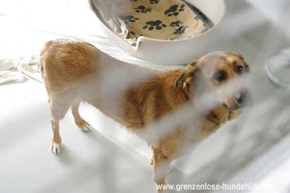 Die Hündin lebte in einer Wohnung und kennt andere Tiere nicht, so die Aussage der Besitzerin. Abgegeben wurde die Hündin wegen Allergie des Babys!