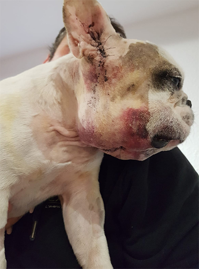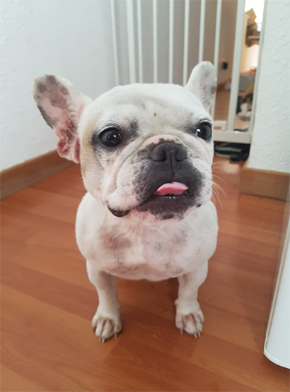 Wir haben sofort angehalten und nachgeschaut und eine kleine French- Bulli Hündin vorgefunden. Sie war total entkräftet und ihr Zustand war miserabel.