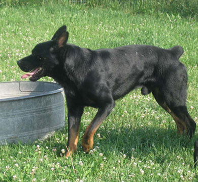 Rüde, nicht kastriert. Er sieht einem Rotti