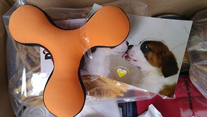 Patenhund Bingy hat ein Päckchen gefüllt mit vielen tollenSachen bekommen :)) Sogleich hat seine treue Gassigängerin Bingy das Bettchen neu gemacht und Leckerli und Spielzeug verteilt :))