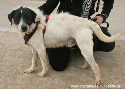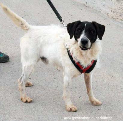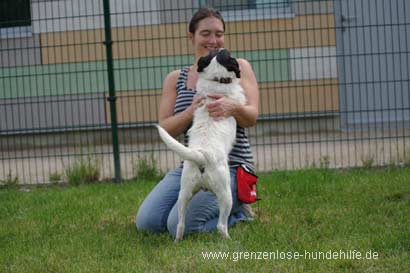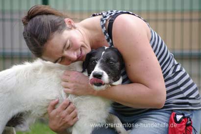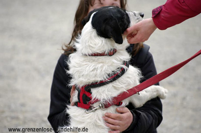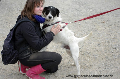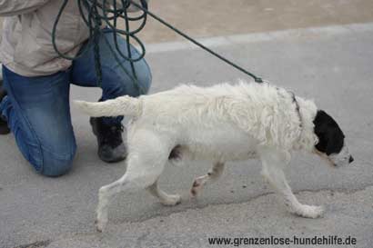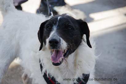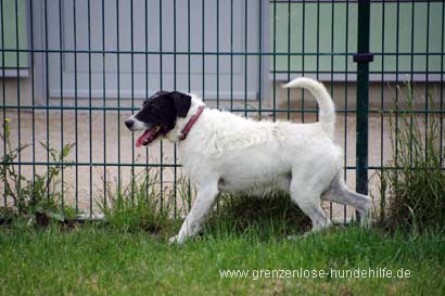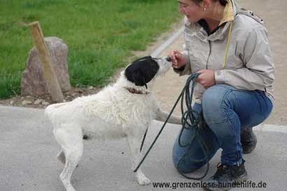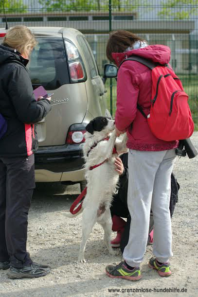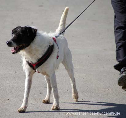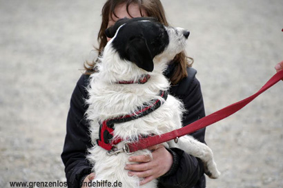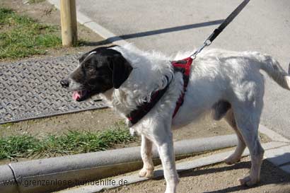 Bloum sieht wirklich toll aus mit seinen längeren Haaren am Hals. Im Zwinger gibt er sich sehr lebendig, aber das Anleinen ist kein Problem. Auch im Freien macht der Spaziergang mit dem gut gelaunten Bloum viel Spaß. Freudig zieht er nach vorne, man merkt, er ist froh, dem Tierheim für eine Weile entronnen zu sein. Gelernt hat der muntere Rüde leider nicht viel, aber er geht ordentlich an der Leine, freut sich über Leckerchen. Andere Hunde werden vorsorglich angeknurrt (man weiß ja nie …), aber das läßt nach einer Weile nach.
