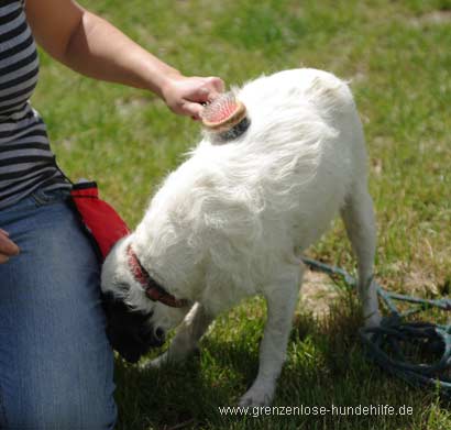 Heute hat mein Liebling Bloum das erste Mal eine Bürste kennengelernt. Als ich Ihn mit dem für ihn offensichtlich unbekannten Objekt bearbeiten wollte, hat er sich erst einmal erschreckt (was sonst nicht seine Art ist) und hinter mir Schutz gesucht. Nachdem ich ihn in kleinen Schritten an das neue Utensil heran geführt habe, hat er sehr schnell begriffen, dass eine Bürste nichts Schlimmes ist, und sich mutig mit den Borsten angefreundet :-)