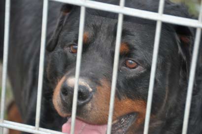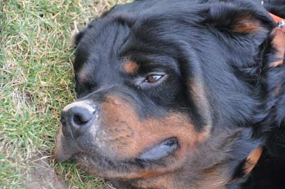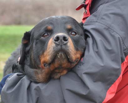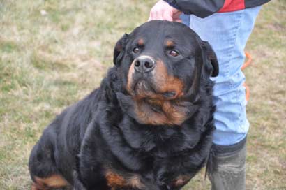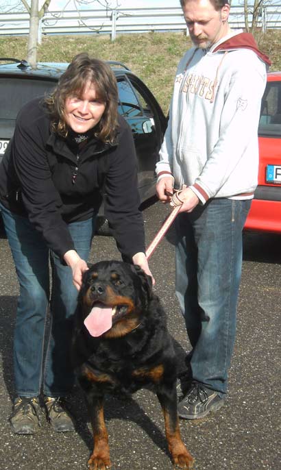 | Bonno, der imposante Rotti ist der schmusebedürftigste Hund, den ich in den letzten Jahren im Tierheim Ebersheim kennenlernen durfte. Beim gemeinsamen Gassigehen kamen wir nicht wirklich vorwärts, weil sich Bonno ständig an meine Beine lehnte und viel lieber Streicheleinheiten einforderte. Kam man dieser Aufforderung nach, legte er sich hin und genoss es so sehr, dass ich manchmal die Befüchtung hatte, er schläft jetzt gleich ein. Dieses Knuddelmonster mit seinen geschätzten 50 kg ist absolut verträglich mit seinen Artgenossen und es sollten sich doch mindestens zwei oder mehr Hände finden, die Bonno in Zukunft verwöhnen können. |