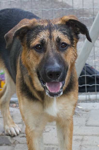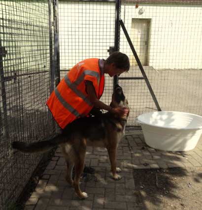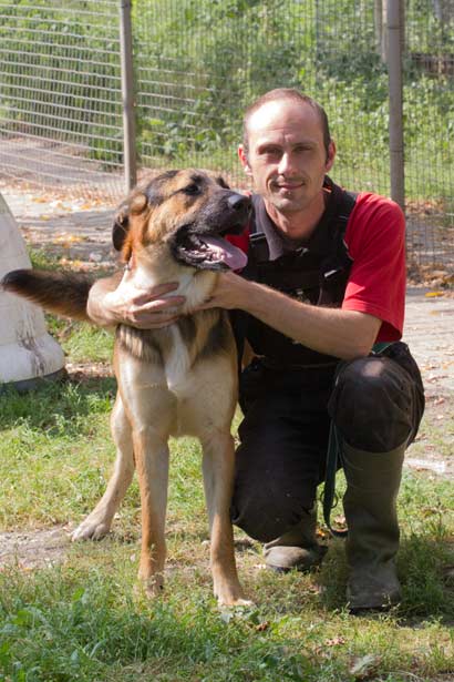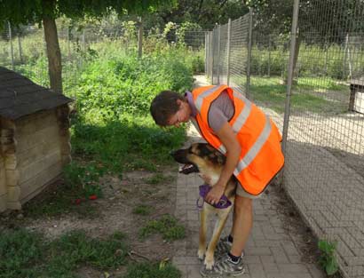 In seinem Zwinger begrüsst er alle Leute sehr freundlich, läßt sich ein Hundegeschirr problemlos anziehen und versucht dabei das Gesicht abzuschlabbern :-))
