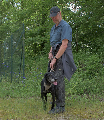 Sichere Verhaltensweisen wahrscheinlich aus seinem früheren Leben – Jagdhund in Zwingerhaltung.