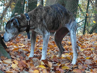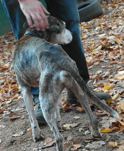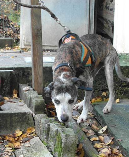 Die alte Mischlingshündin wurde von Kindern gefunden. Hilflos angebunden an einem Baum :((( Sie haben die sehr, sehr dünne Hündin ins Tierheim gebracht.