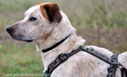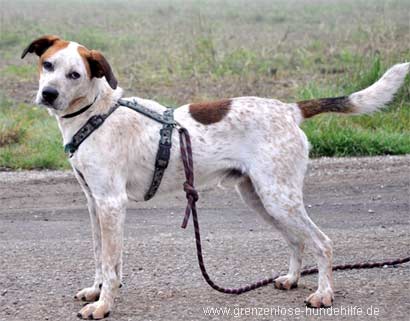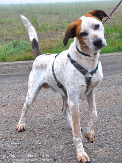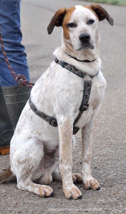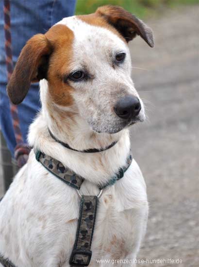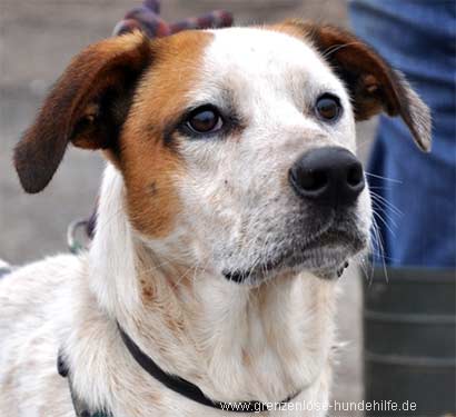 Der junge Rüde ist unsicher und pöbelt im Zwinger erst mal rum, wenn man sich dann allerdings etwas mit ihm beschäftigt, hat man ruckzuck einen aufmerksamen und interessierten Begleiter an seiner Seite.