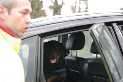 | Caid befolgt auch beim Katzengehege brav die Kommandos. |