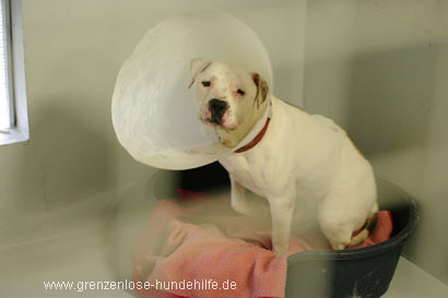 Als ob Capone bis hierher nicht schon genug ertragen mußte kamen nach seiner Kastration Komplikationen hinzu. Eine Kopfverletzung die sich schrecklich entzündete und dann bekam er auch noch Probleme mit seiner Verdauung. Nochmals tierärztlich untersucht wurde eine Analhernie festgestellt, auch “Darmtasche” genannt. Er hatte große Schmerzen und mußte dringend operiert werden. Die OP ist gut verlaufen und Capone befindet sich auf dem Weg der Besserung!!