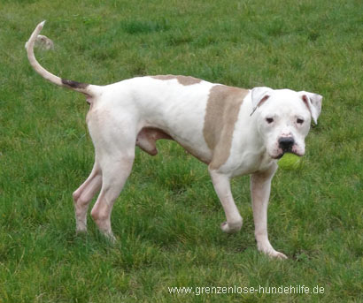 Der arme American Bulldogg Mix Rüde wurde aus schlechter Haltung von der Polizei beschlagnahmt. In seinem alten Zuhause durfte er nur in einem engen Flur leben, war stark unterernährt und wurde schlecht behandelt..