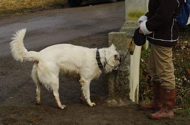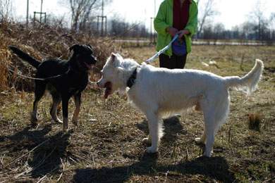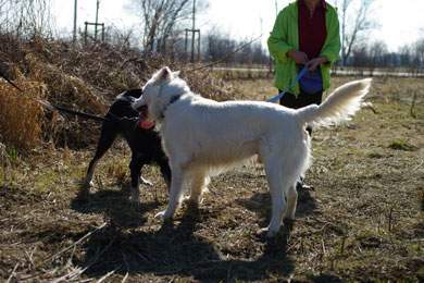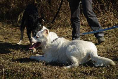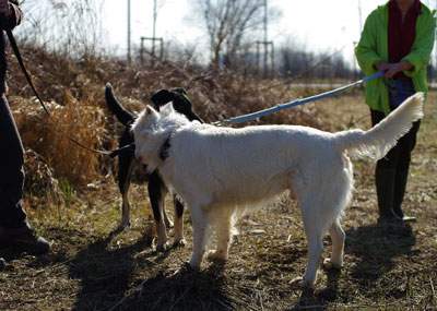 Problemlos geht Carnac mit unseren Hunden einem Rüden und zwei Hündinnen zusammen Gassi :-))) |