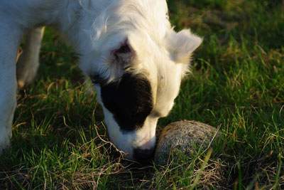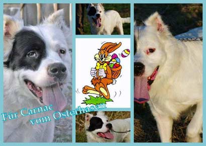 Sie hat für Carnac sehr liebevoll ein Osterwichtel Paket zusammengestellt und Ihm geschickt :-)) Vielerlei Leckereien waren dabei, eine neue Decke, eine neue Leine und selbstgemachte Hunde - Ostereier!! Wir haben Carnac das Paket gebracht und er hat neugierig rein geschaut und sich direkt bedient.:-) Er hat natürlich genüßlich gemampft!