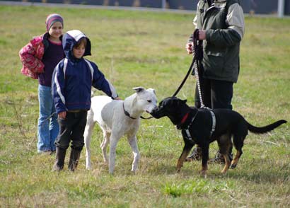 Sie spielte ausgiebig mit meiner Hündin, ist also mit Artgenossen beiderlei Geschlechts verträglich. Mit Kindern hat die sehr menschenbezogene Hündin gar kein Problem. Da sie eine echt Wuchtbrumme ist, ist es natürlich von Vorteil wenn sowohl Kinder als auch Hunde in ihrer Umgebung etwas standfester sind ;)