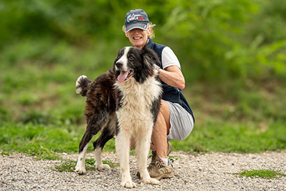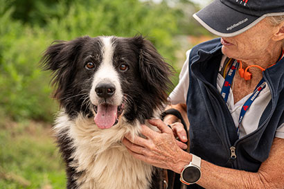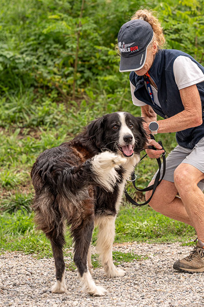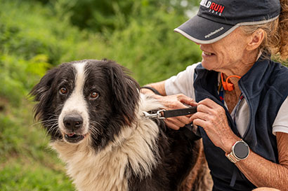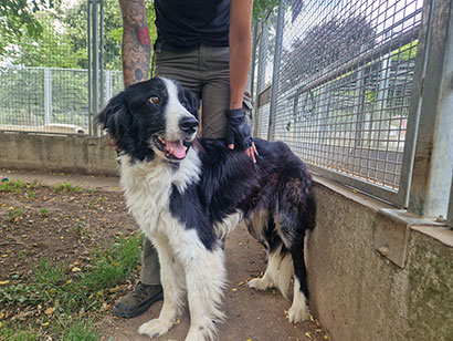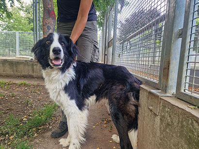 Der grosse, 9 Jahre alte Border Mix (vielleicht mit Sennenhund) wurde im Wald gefunden.