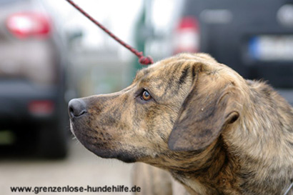 Er hat gelernt ohne zu Murren an Autos, sowie an anderen Hunden vorbei zu gehen.