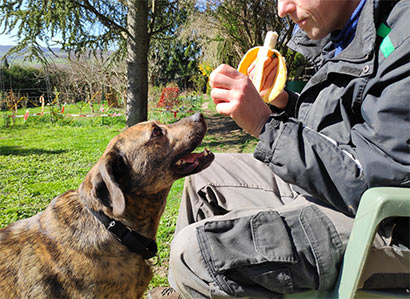 Zuvor hat Charly fleissig bei der Gartenarbeit geholfen, deshalb bekommt der Bub in der Pause auch die Hälfte der Banane ab ;)) (mh)