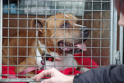 Der dünne American Stafford Rüde Cheyenne wurde unterkühlt und schwer atmend in den Reben liegend gefunden.