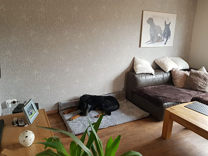 Er wird zunehmend entspannter und bleibt auch mal irgendwo liegen, wenn man den Raum kurz verlässt.