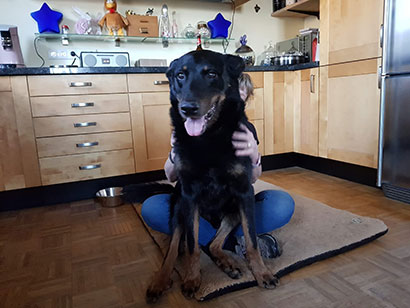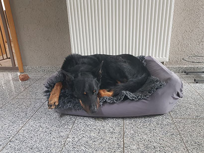 Er kommt die Stufen zu unserem Haus noch gut hoch und runter. Mit glatten Böden hat er ein kleines Problem, wie es eben viele alte Hunde haben.