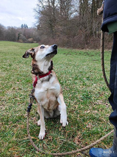 Die Spaziergänge mit Chipie sind sehr angenehm, sie läuft gut an der Leine und ist aufmerksam.