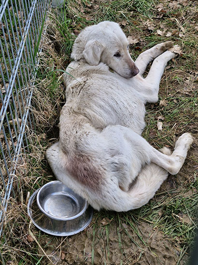 Die vier Hunde, Montagne de Pyrénées / Labrador Mixe, waren klapperdürr und eine Hündin war so sehr ausgemergelt, dass sie kurz vor dem Hungertod war.