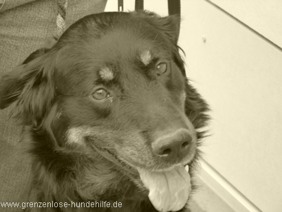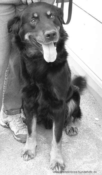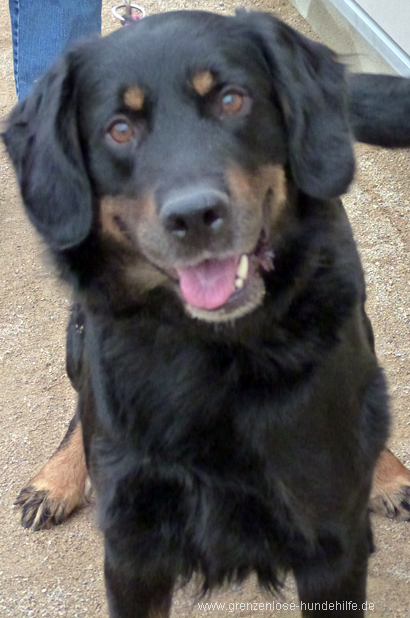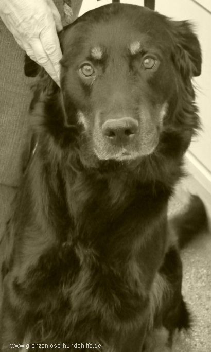 Wir denken das es sich hier um einen Hovawart Mix handelt. Chopin wurde im Tierheim abgegeben, weil seine Besitzer Drillinge bekamen und sie Ihn vernachlässigten.