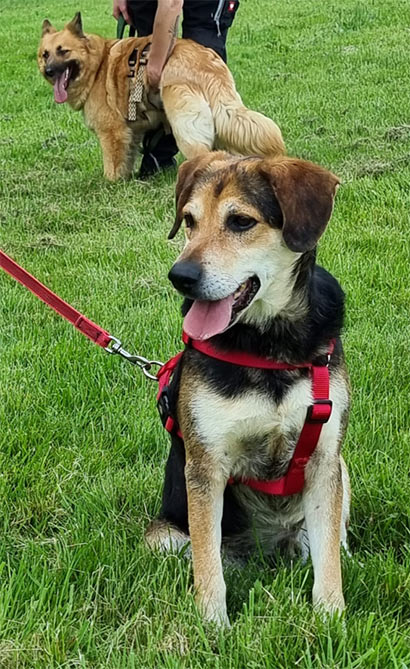 Er scheint uns oft weit weg in seinen eigenen Gedanken zu sein. Chuck kennt es an der Leine zu gehen ist stubenrein auch bei ihm vermuten wir das er vor dem Krieg eine Familie gehabt haben muss.