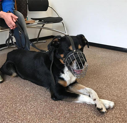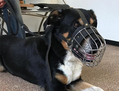 Zur Sicherheit hat man ihm einen Maulkorb angelegt, doch er hat alles sehr brav und ohne Murren mitgemacht, hat sich auf den Tisch gelegt und sich untersuchen lassen.