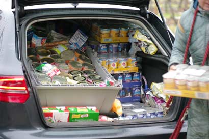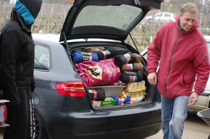 Alle halfen fleißig mit und nachdem sein Auto bis unters Dach mit Decken Transportboxen, Trockenfutter Leckerlis, Nassfutter und vielem mehr bis auf den letzten Zentimeter gefüllt war, machte er sich mit seiner Bekannten Laura auf den wirklich weiten Weg (einfache Strecke 752 km) nach Colmar.