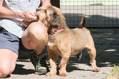 Sein Geschirr und die Leine lässt er sich ohne Probleme anlegen. Das Abziehen des Geschirrs muss zügig gemacht werden, sonst kann er etwas ungeduldig werden. Hält man ihm die Leckerlis von oben hin, nimmt er sie manchmal etwas stürmisch. Bietet man sie ihm von unten an, nimmt sie Djeki langsam entgegen. Das Bürsten ist kein Problem. Streicheln liebt er, jedoch gefällt es ihm nicht, wenn man damit aufhören will. Tja, das ist eben Djeki…..
