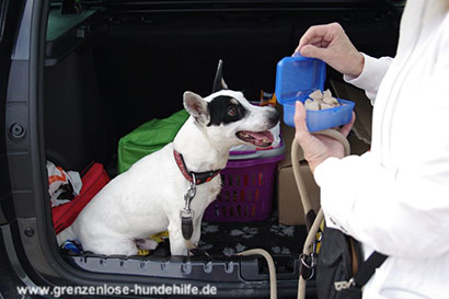 Dankbar nimmt Dusty alles an und seine Augen strahlen dabei. Als ich sah, dass Dusty nur auf ein paar Decken schlief holte ich Ihm ein gespendetes Hundebett und brachte es dem lieben Bub.