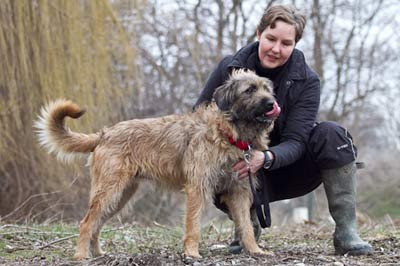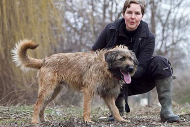 mit wehendem Haar im Wind und hat sich Herrchen