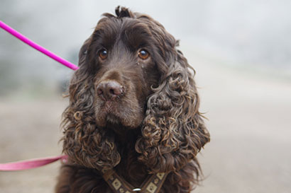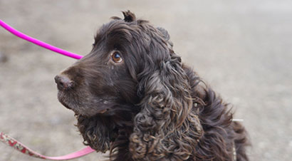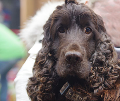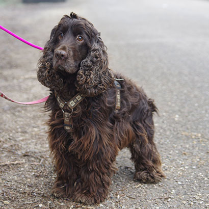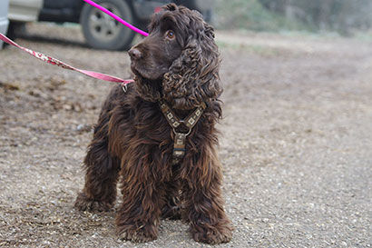 Der liebe und verträgliche, dunkelbraune Cocker- Spaniel Rüde Efferalgan wurde von einem Paar bei einem Vermehrer aus Mitleid aus der Box heraus gekauft.