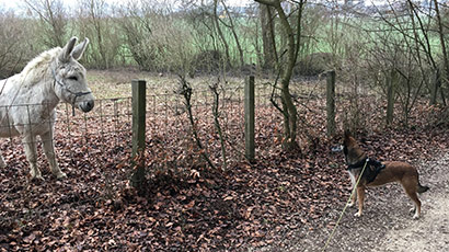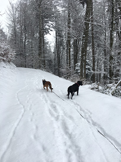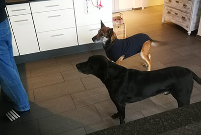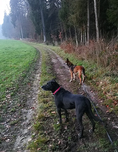 Mit unserem Rüden Tyson verstand sich Elga anfangs gar nicht gut, als wir dann aber so ab dem 7. Januar wieder mit beiden Hunden spazieren durften, freundete sie sich immer wie mehr an.