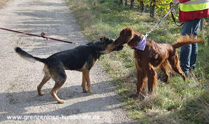 Eliott erholt sich zusehends. Seine Gassirunden betragen nun 3 mal 30 Minuten, die er, wenn er dürfte, gerne schon richtig ausdehnen würde:) Hundebegegnungen findet er toll und freut sich.