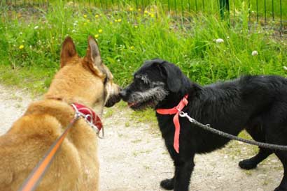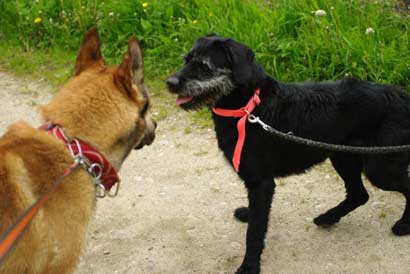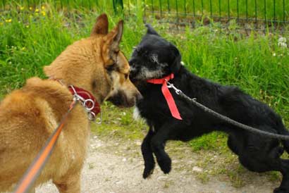 | Ellie hätte gerne mit Matilde gespielt, leider waren die Leinen zu kurz... |